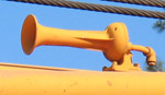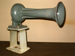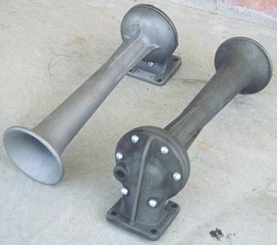![]() | The A-2 was a single-note horn used primarily on switchers, locomotive cranes, self-propelled railcars, and the like. It was available in both a 15 inch "long bell" version, pictured above, and a 11-5/32 inch "short bell" version, pictured in the two photos at left. Wabco also produced a two-chime AA-2 horn which combined a long and short bell A-2 on a common manifold. The A-2 was fairly common on Alco switchers of many railroads.