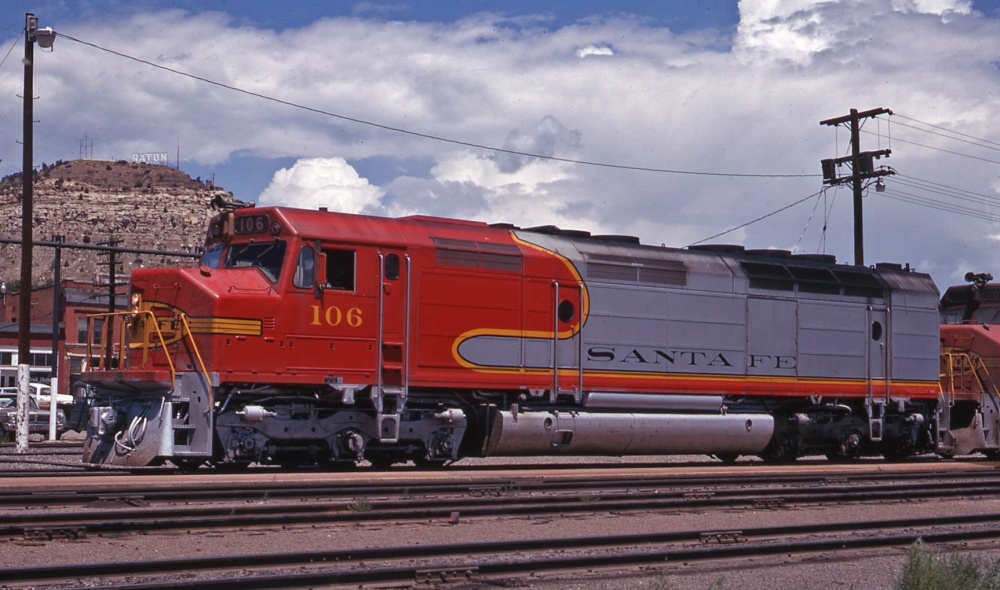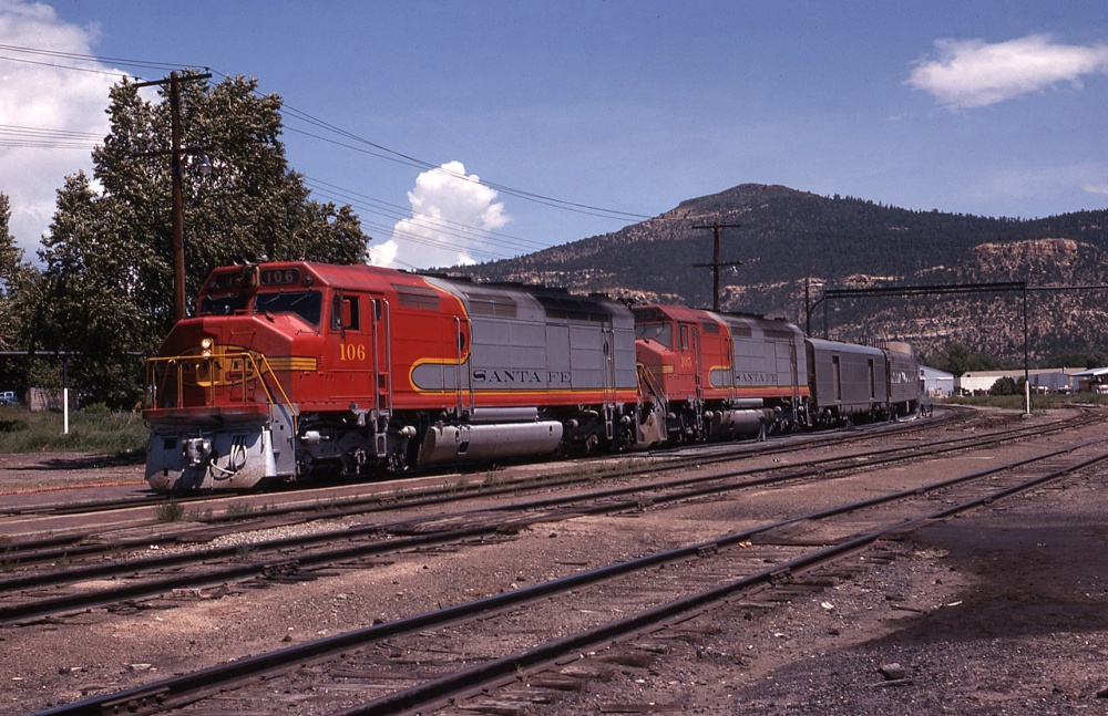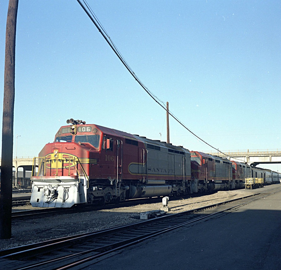 Chief was a real rarity, but it happened at least this once. By this date, 106 had traded its three-chime horn for a five-chime Leslie S-5T, Santa Fe's most common "passenger" horn. Photo by John Tudek from