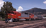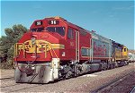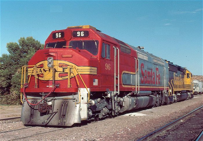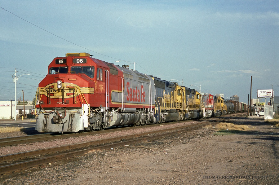The 96 had lost its "Desert Storm" flag and acquired a mismatched set of numberboards by the time Thomas Richardson caught it leaving Mobest Yard in Phoenix, AZ with the evening manifest destined for Belen, NM on July 23, 1994. |