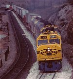 The 5996 was back in blue and yellow by the time Steve Sloan caught it on a train at Walong, CA on Tehachapi Pass in May 1989. It wouldn't be long before the unit was back in the paint booth for the application of yet another paint scheme. |
