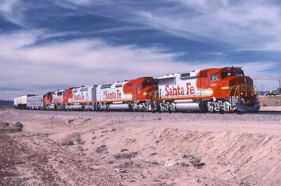 warbonnet scheme. Bob Finan caught the unit leading an F45 in the older scheme through Torrance, CA on its way