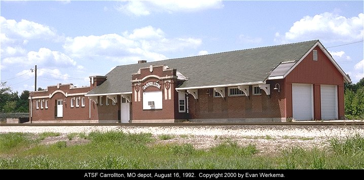 Most of the Santa Fe depots that survive on-site between Kansas City and Chicago have been heavily modified for use by maintenance of way forces. A portion of the waiting room of the handsome Carrollton, MO depot had been removed and the remainder converted to a garage by the time this picture was taken in 1992. |
