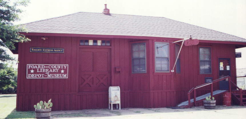 | The Kansas City Mexico & Orient built a 24'x102' depot at Crowell in 1909. Santa Fe cut it down to 24'x45' in 1943 - a fate that would be visited upon many large KCM&O depots in the early 1940's. The Crowell depot became the Foard County Library and Depot Museum after its tenure with the Santa Fe. Photo by Jim King, August 1997. |