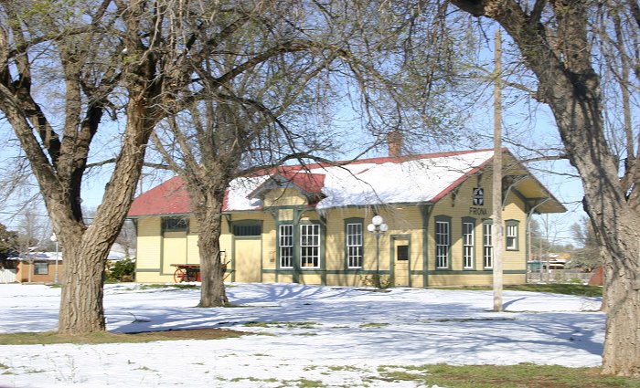 | The 24x64 depot at Friona, TX is one of only a few depots outside of the Gulf Lines that combined the pre-1910 style 12 and 8-pane windows and "cobweb" style roof brackets with the post-1910 standard shiplap siding (the depots down the line at Bovina and Farwell were other examples). The depot was moved to a park in town and restored in 1985. Although not immediately apparent in this 2005 photo by Shane Murphy, the depot has been re-sided with low maintenance siding, and the diamond-shaped asbestos shingles have also been replaced. The depot appears to have had few modifications during its years along the Santa Fe. The waiting room door lost its transom at some point, and a short window in one corner of the waiting room indicates the installation of an indoor restroom, replacing the "water closet" down at the end of the platform. |