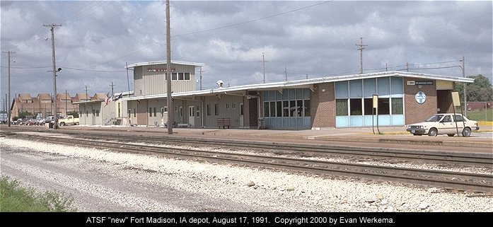 Two Santa Fe depots survive at Ft. Madison, IA. The first is the 1910-built brick depot at mile 232.9 near downtown. Now serving as a museum, the depot was almost-but-not-quite unique on the system. The now-gone Alva, OK depot was fairly similar in appearance when built (it had a nearly identical tower, later removed), and the Bartlesville, OK depot also had some similar features. In 1968, Santa Fe built a new depot at mile 234.3, close to the Santa Fe shops and the timetable location of Shopton. One of the last new depots built before Amtrak, the modern structure still serves the Southwest Chief. The remains of one of the shop buildings can be seen in the background of the lower picture. |