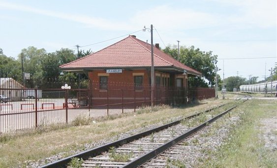 ![]() | Not at all typical of Santa Fe brick depots, this structure was built in 1914 by the Fort Worth & Rio Grande, a Frisco predecessor. Santa Fe acquired the line and the depot in 1937. The depot is now home to the Hood County Genealogical Society library and archives. Chris Fleury took these photos of the depot on May 15, 2002. |