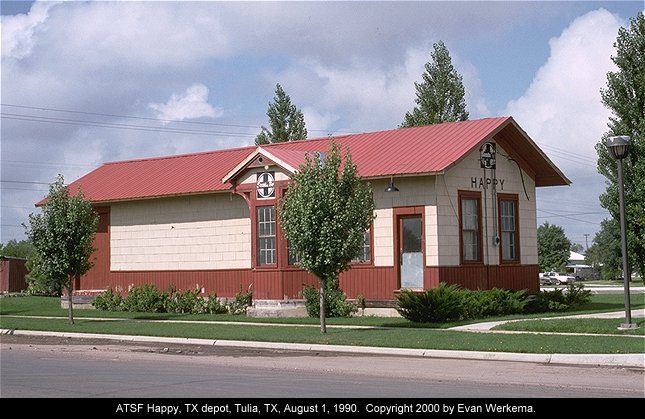 | The Happy depot was built in 1907 following the pre-1910 #1 standard plans. The 16x40 depot received a 15 foot extension to the freight/baggage room in 1915. At some point in the 1960's, it was rebuilt with asbestos siding, but managed to keep its bay window. The depot survived on-site into the mid-1980's, when it was moved south to Tulia, TX to become an historical display. A Happy ending, to be sure... |