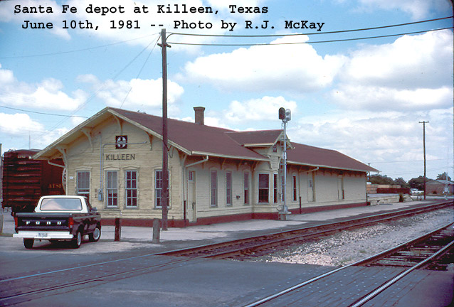 ![]() | Killeen had a typical large Gulf Colorado & Santa Fe frame depot. R.J. McKay stopped by and recorded these two images in 1974 and 1981. Note the modern train order signal in front of the bay window. |