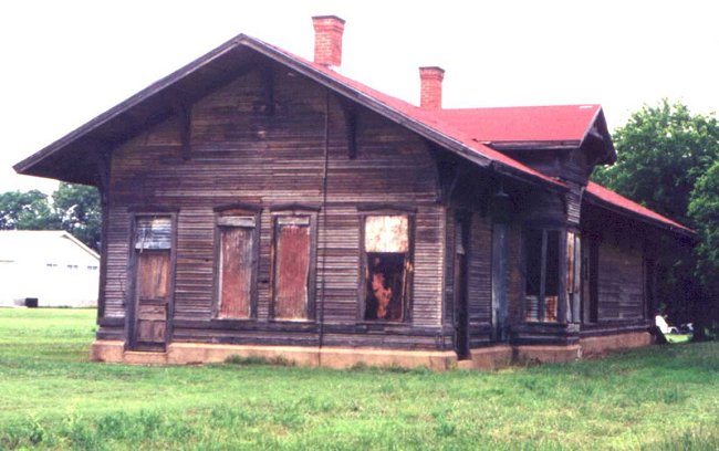 | When Lake Whitney was impounded, it forced the Santa Fe to relocate their main line to the east, bypassing the communities of Kopperl and Blum, TX. Amazingly, the depots at both locations survived. The Kopperl depot was in poor shape when Jim King photographed it in 1999. |