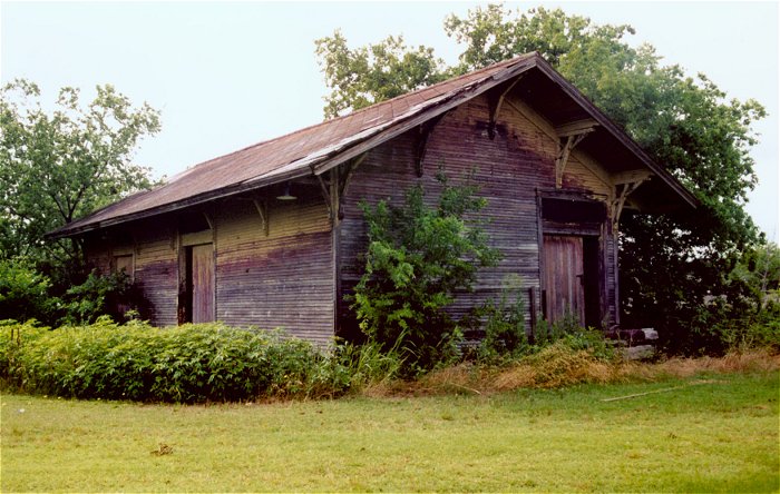 | This building appears to be the freight section of the depot from Krum, TX. Fred Napp found it behind the Krum Feed store north of town and photographed it in June of 2001. |