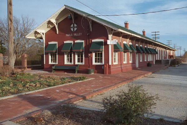 | In the mid-1990's, the community acquired the depot and restored it (after a fashion) as a museum. Brent Frerck photographed the building in February 1999. Santa Fe 2-8-0 #1951, formerly at Wacker Park, was moved nearby for display. The museum was supposedly going to leave room in the depot for a passenger waiting area should Amtrak service resume at some point in the future. Amtrak service returned in 1999 in the form of the Heartland Flyer, but reportedly passengers at Pauls Valley must wait outside the depot for the train. Brent Frerck photo. |