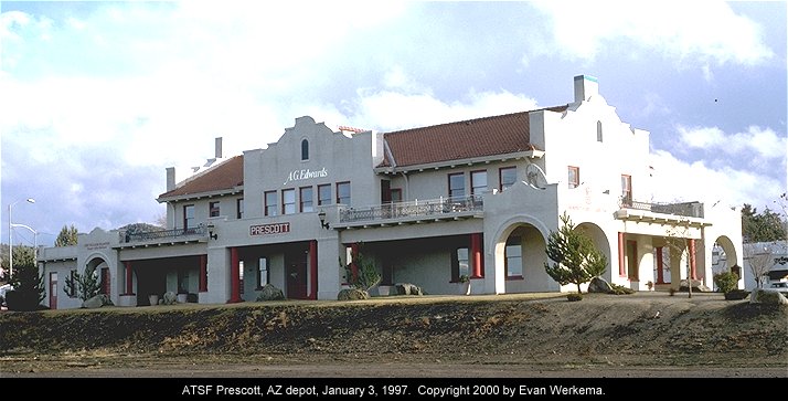 The grand SFP&P depot and office building at Prescott, AZ was built in 1907. Originally on the main line, Prescott was bypassed by a line change between Abra and Skull Valley in the 1960's. The branch from Abra to Prescott survived into the early 1980's before being severed by a washout. The Prescott depot was derelict by the early 1990's, but thankfully, better times lay ahead. The view above shows the structure as it appeared in 1998 following refurbishment into office and retail space for several local businesses. Unfortunately, a new building would soon be built in the cleared area in the foreground, making the depot difficult to photograph from the "track" side. |