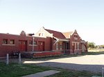room. Waynoka enjoyed a moment of fame in 1929, when Trancontinental Air Transport (a TWA predecessor) began a an air-rail service that promised coast-to-coast travel in under 48 hours. Intended as an interim solution until overnight flights were possible, the service called for passengers to travel overnight on the Pennsylvania Railroad from New York to Columbus, OH, board a Ford Tri-Motor for a daytime flight to Waynoka, have dinner in the Harvey House, board a train for an overnight trip to Clovis, NM, have breakfast at the Gran Quivera Harvey House, then board another plane for the final leg to Los Angeles. The service lasted less than two years before planes took over the entire route. Fred Harvey service lasted at Waynoka until 1937. The railroad continued to use the Harvey House as a crew "reading room" into the 1990's. At some point the depot and Harvey House were given an ill-conceived coat of cream-colored paint over the bricks with red trim on the woodwork, as shown in the top photo. The depot was retired in 1986 and converted into a museum. The Waynoka Historical Society now owns and manages both structures. These September 2002 photos by Shane Murphy show the depot and Harvey House following the removal of the paint. |