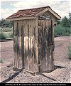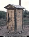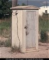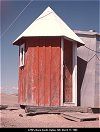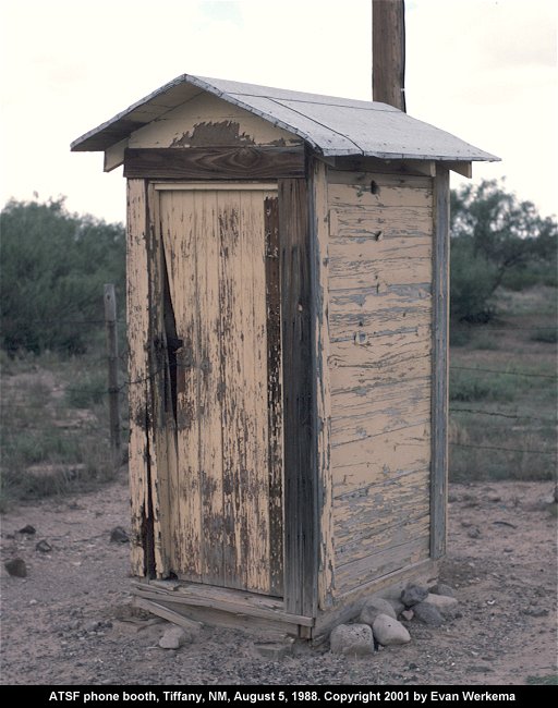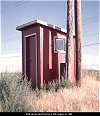 ![]() | In 1986, there were still many phone booths on the line from Clovis to Carlsbad, NM. Many of them were of the style of this booth at Chisum, NM, with board and batten siding and the remains of a window in the door. | ||||